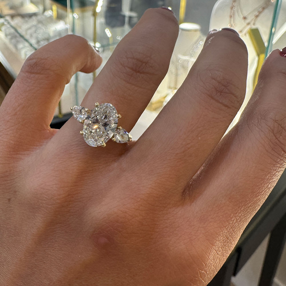 This classic Three Stone engagement ring with Round Brilliant diamonds is featured in White gold with delicate claw. This gorgeous diamond engagement ring is set with oval cut diamond in the centre and two round brilliant cut diamonds on both sides forming a beautiful trilogy setting. All Temple and Grace jewellery is beautifully crafted to the highest standards and is made at our jewellery workshop directly by us (jewellery craftsmen). This is why you can save over 40% when compared to high-street retail prices. We also offer a lifetime guarantee and unmatched 100 day returns. You can shop online or visit our jewellery stores in Sydney, Melbourne, Brisbane, Perth and Adelaide or book an appointment to visit our jewellery boutiques.