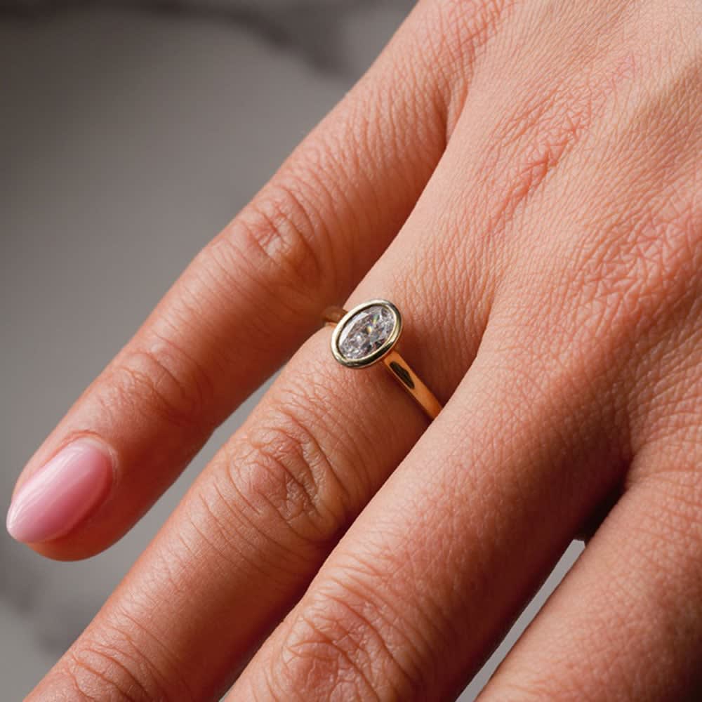 This oval engagement ring augments a stunning diamond with impeccable brilliance studded in the centre in a bezel setting. The glossy and polished band enhances the charm aesthetically. Dainty yet durable, elegant, and unique, this ring will shine for years to come. It is available in 18K white, yellow, rose gold, platinum 600, and platinum 950. The jewellery is beautifully handmade to the highest standards. Shop directly from us and save over 40% when compared to high-street retail prices. We also offer unmatched 100 day returns. Buy online or book an appointment to visit our jewellery boutiques in Sydney, Melbourne and Brisbane.