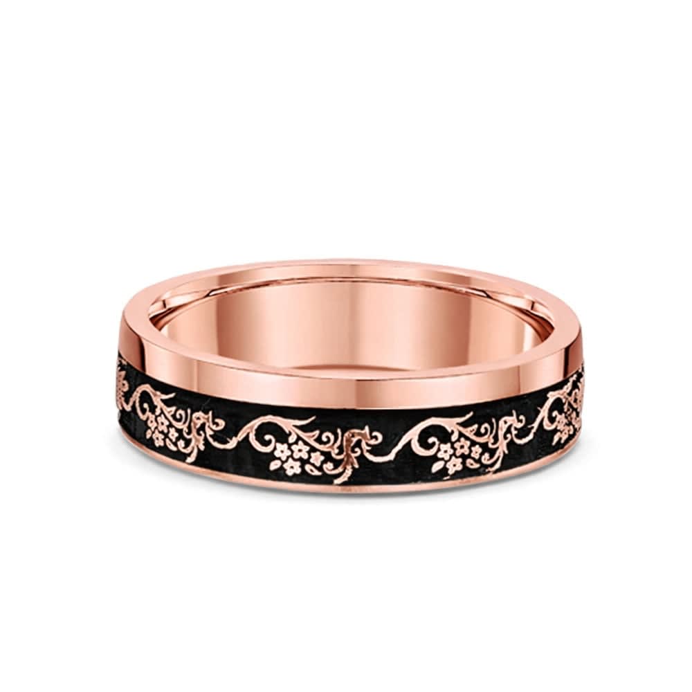 The centre of the ring features a highly detailed carved strip of flowered design along with an elegant border .It has smooth, shiny, flat edges, which make this ring an ideal contemporary choice for a wedding . All Temple and Grace jewellery is beautifully crafted to the highest standards and is made at our jewellery workshop directly by us (skilled jewellery craftsmen). This is why you can save over 40% when compared to high-street retail prices. We also offer a lifetime warranty and unmatched 100 day returns. You can shop online or book an appointment to visit our jewellery boutiques in Sydney, Melbourne, Brisbane and Perth.