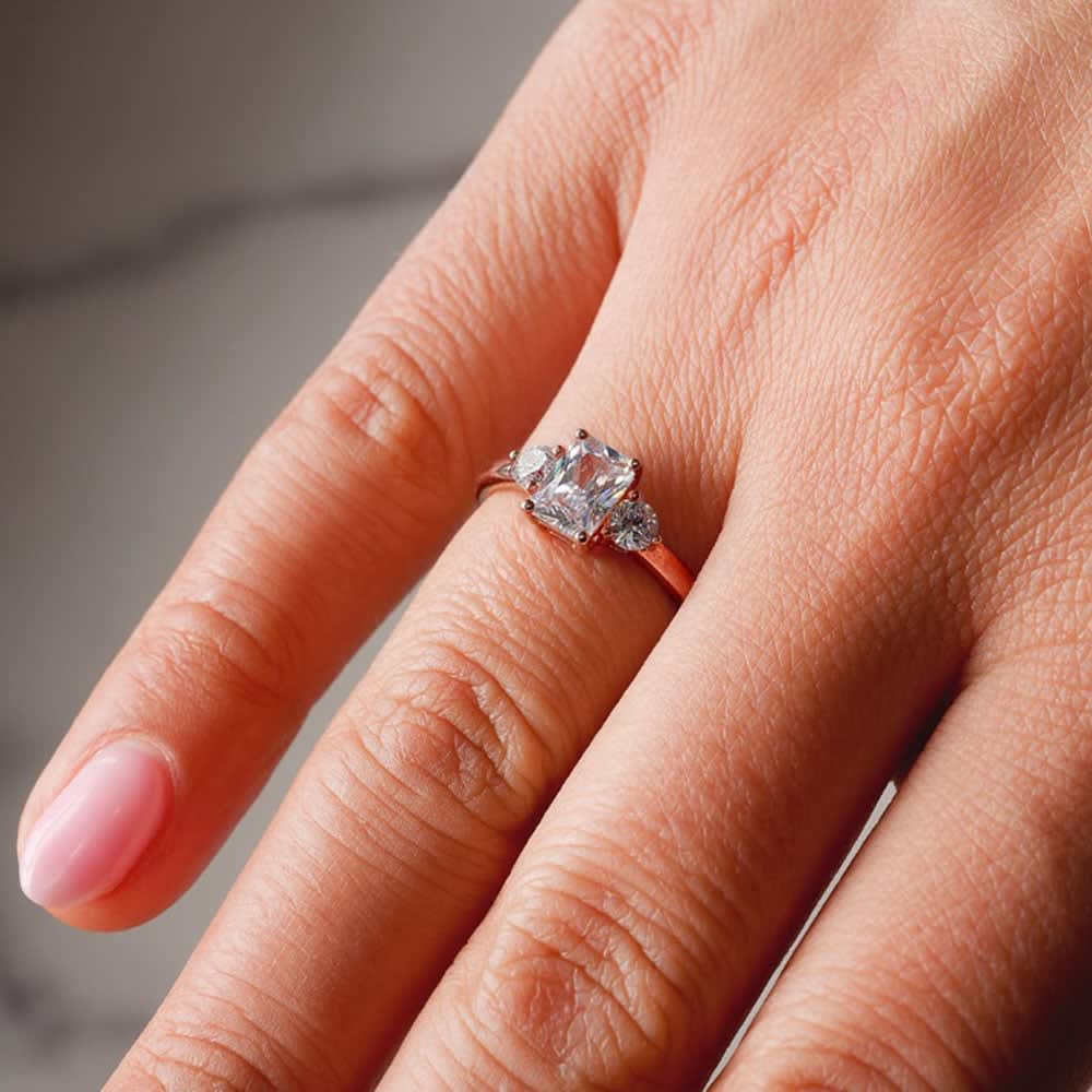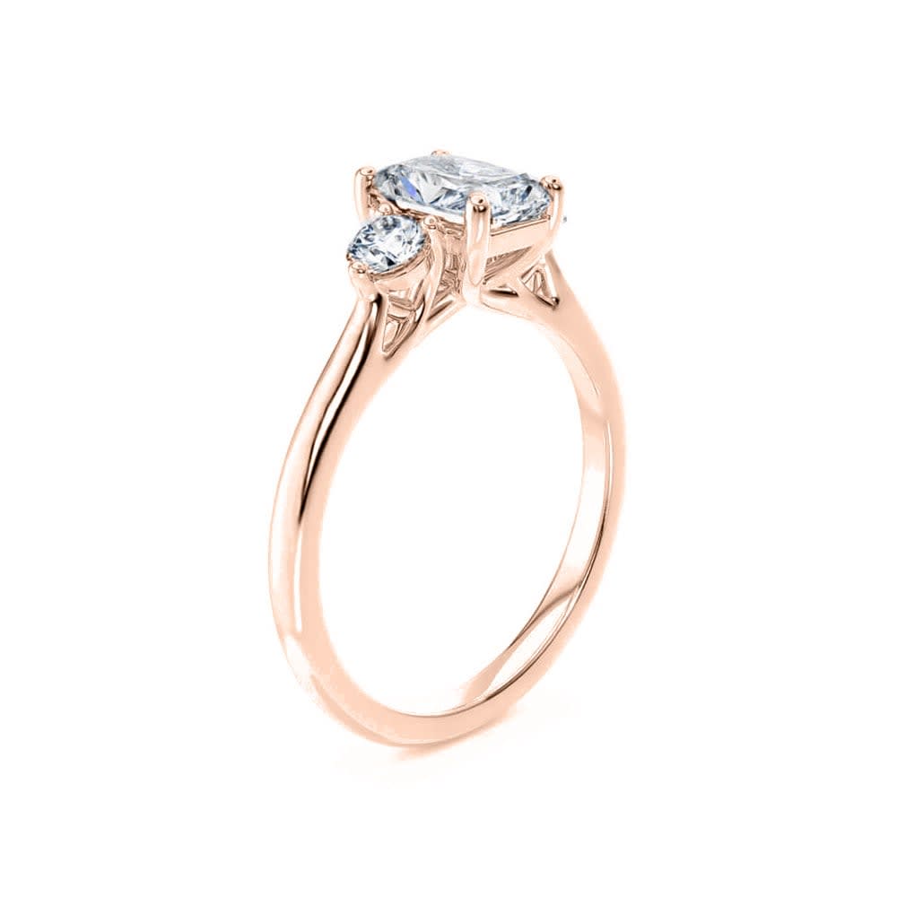 Redefine glamour with this stunning three-stone diamond engagement band in shimmering 18k gold. radiant cut diamond is flanked by two round diamonds on the sides. The glistening diamond ring captivates with its simple and elegant design. This band is available in 18K white, yellow, rose gold, and platinum 950. The jewellery is beautifully handmade to the highest standards. Shop directly from us and save over 40% when compared to high-street retail prices. We also offer unmatched 100 day returns. Buy online or book an appointment to visit our jewellery boutiques in Sydney and Melbourne.