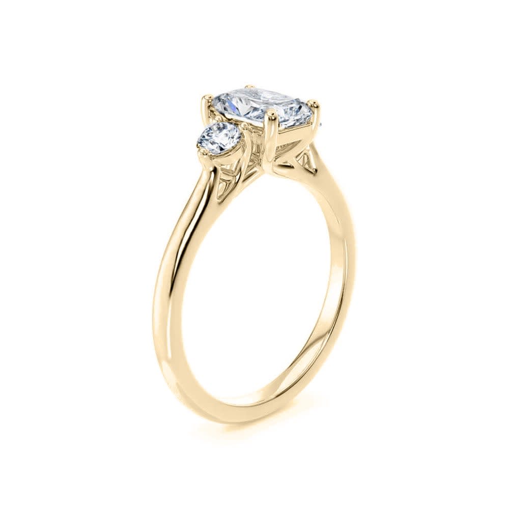 Redefine glamour with this stunning three-stone diamond engagement band in shimmering 18k gold. radiant cut diamond is flanked by two round diamonds on the sides. The glistening diamond ring captivates with its simple and elegant design. This band is available in 18K white, yellow, rose gold, and platinum 950. The jewellery is beautifully handmade to the highest standards. Shop directly from us and save over 40% when compared to high-street retail prices. We also offer unmatched 100 day returns. Buy online or book an appointment to visit our jewellery boutiques in Sydney and Melbourne.