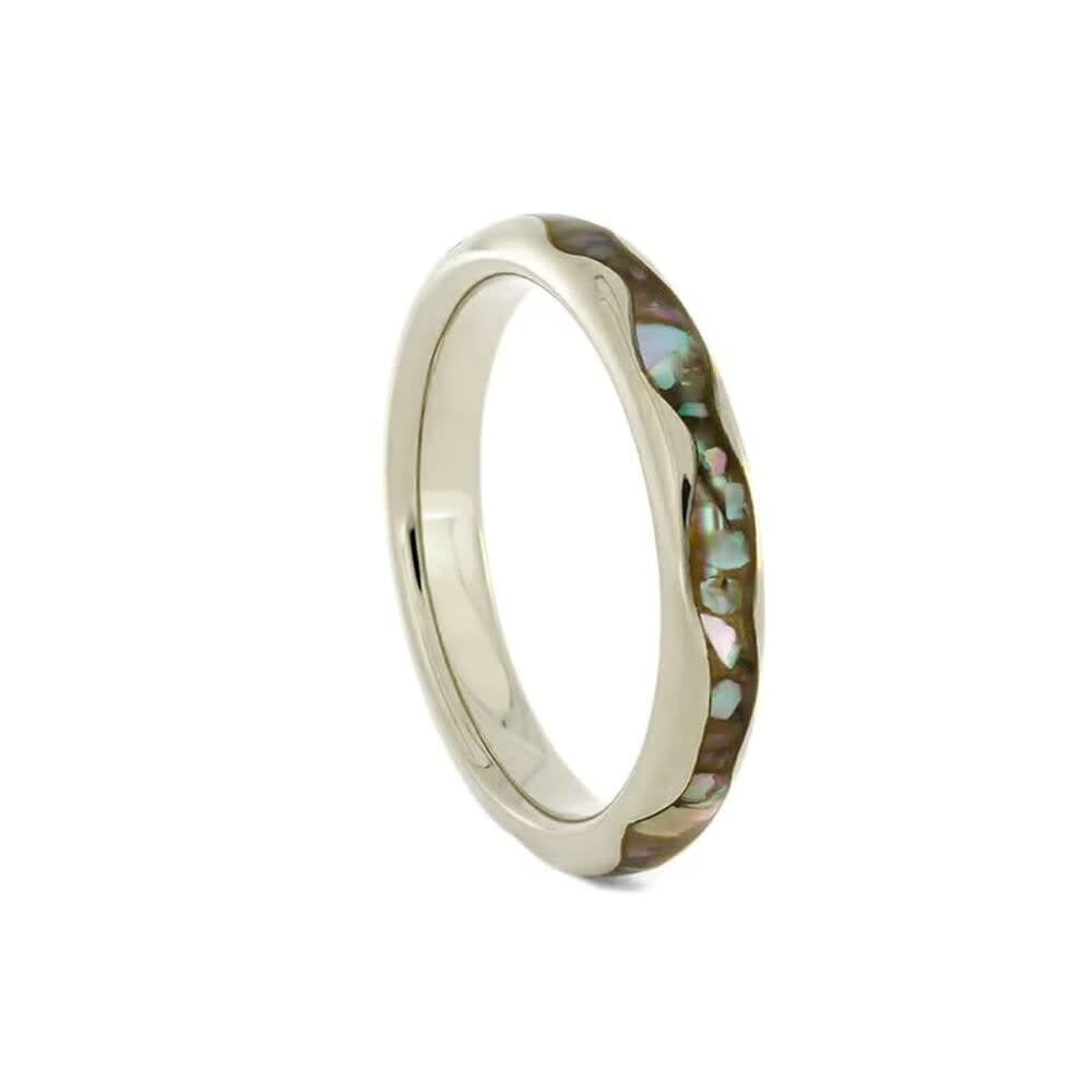 This women's wedding ring features a crushed abalone centre that gives off a vibrant and iridescent glow, creating a mesmerizing effect. The crushed abalone centre is further enhanced by lovely wavy patterns in the edges of the ring. These patterns add a touch of elegance and sophistication to the design, creating a beautiful contrast with the crushed abalone. The combination of the vibrant centre and the elegant edges gives it a truly one of a kind look that is both striking and beautiful. All Temple and Grace jewellery is beautifully crafted to the highest standards and is made at our jewellery workshop directly by us (skilled jewellery craftsmen). This is why you can save over 40% when compared to high-street retail prices. We also offer a lifetime warranty and unmatched 100 day returns. You can shop online or book an appointment to visit our jewellery boutiques in Sydney, Melbourne, Brisbane, Perth and Adelaide.